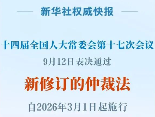 十四届全国人大常委会第十七次会议9月12日表决通过,新修订的仲裁法,自2026年3月1日起施行